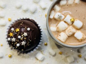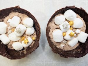 Ring in the new year with your little ones with these fun midnight hot cocoa bombs! They will love to watch the chocolate sphere melt and the fun stuff fill their mugs! Silver and gold star sprinkles add a little new year’s eve sparkle to the classic hot cocoa and mini marshmallow combination!