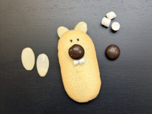 1. Lay out four cookies. Use icing to adhere almonds for ears, candy for noses, and marshmallow pieces for teeth. Add eyes with edible marker.