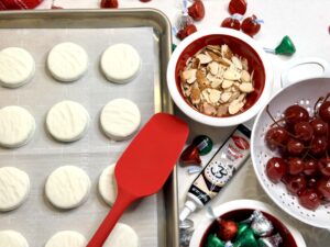 - Dip a cherry into the melted chocolate just slightly up onto the stem (whole cherry plus a bit of the stem get dipped). Place the cherry onto the cookie, slightly off center to allow room for the holly decoration.