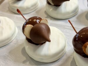 - Lay out twelve white fudge covered oreos. Unwrap Hershey kisses. Drain and rinse cherries, dry well.