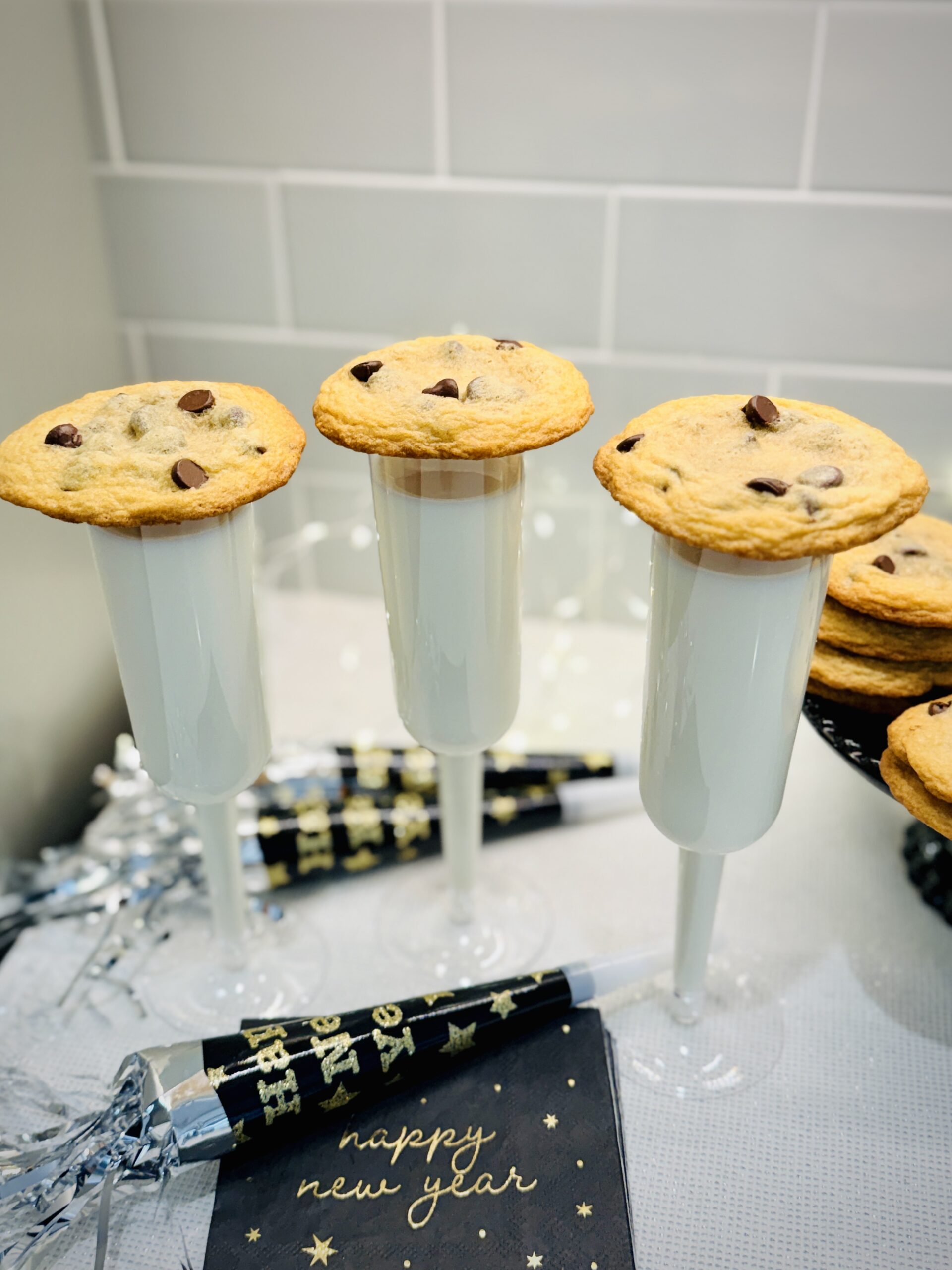 For a simple cute midnight toast to ring in the new year with kids, use plastic champagne glasses for milk and top each glass with your favorite chocolate chip cookie!