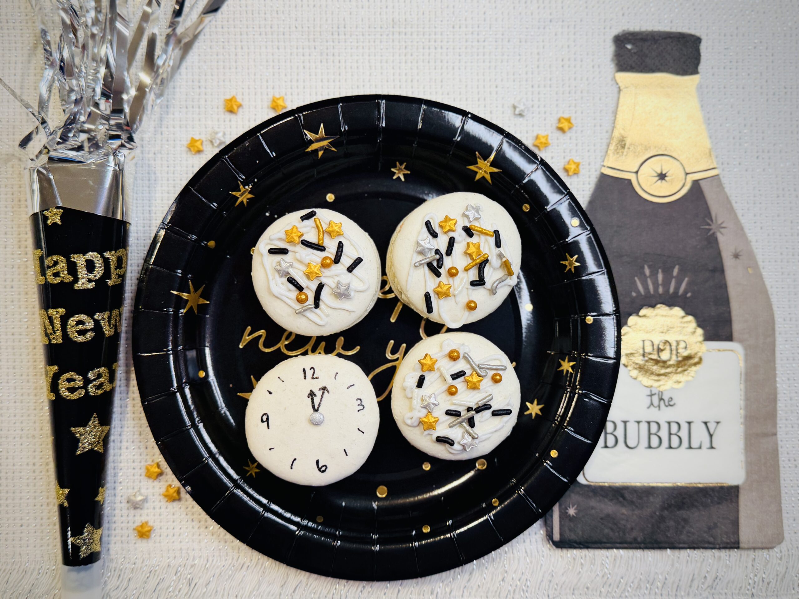 Pick up vanilla macarons at your favorite bakery and add these new year’s themed decorations for an easy, delicious, and fun addition to your celebration!